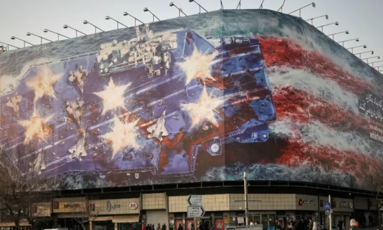 Duminică, autoritățile de la Teheran au instalat în Piața Enqelab-e-Eslami un banner monumental care redă un portavion american complet devastat în mijlocul violenței. Pe puntea navei — avioane de luptă în flăcări și cadavre întinse sub cerul gri — urme de sânge se scurg în apă, sugerând o viziune grotescă asupra inevitabilei răzbunări.