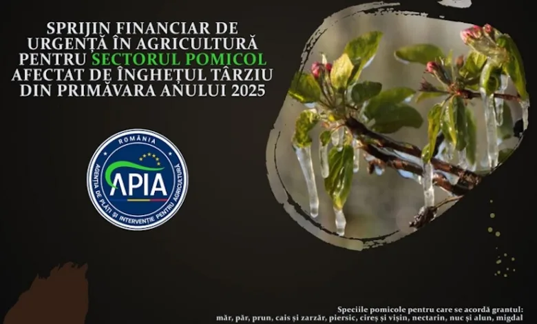 Agenția de Plăți și Intervenție pentru Agricultură (APIA) anunță că, până la data de 9 martie 2026 inclusiv, fermierii din sectorul pomicol pot depune cereri pentru acordarea sprijinului financiar de urgență destinat compensării pierderilor provocate de înghețul târziu de primăvară din perioada aprilie–mai 2025.