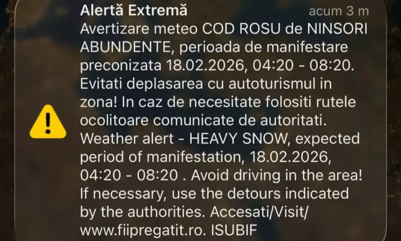 În dimineața zilei de 18 februarie 2026, locuitorii din București și Ilfov au primit un mesaj RO‑ALERT în jurul orei 04:20, prin care autoritățile au avertizat asupra condițiilor meteorologice extreme care urmau să afecteze capitala. Notificarea a venit pe fondul codului roșu de ninsoare abundentă și viscol, valabil în primele ore ale dimineții.