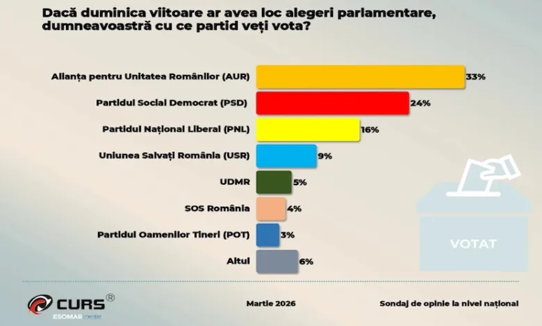 Cel mai recent sondaj realizat în martie 2026 de Centrul de Sociologie Urbană și Regională (CURS) aduce în prim-plan schimbări importante în preferințele electorale ale românilor. Deși AUR își menține poziția de lider în intențiile de vot pentru alegerile parlamentare, partidul înregistrează o ușoară scădere față de începutul anului. În același timp, PSD recuperează teren, în timp ce PNL și USR continuă să piardă procente.